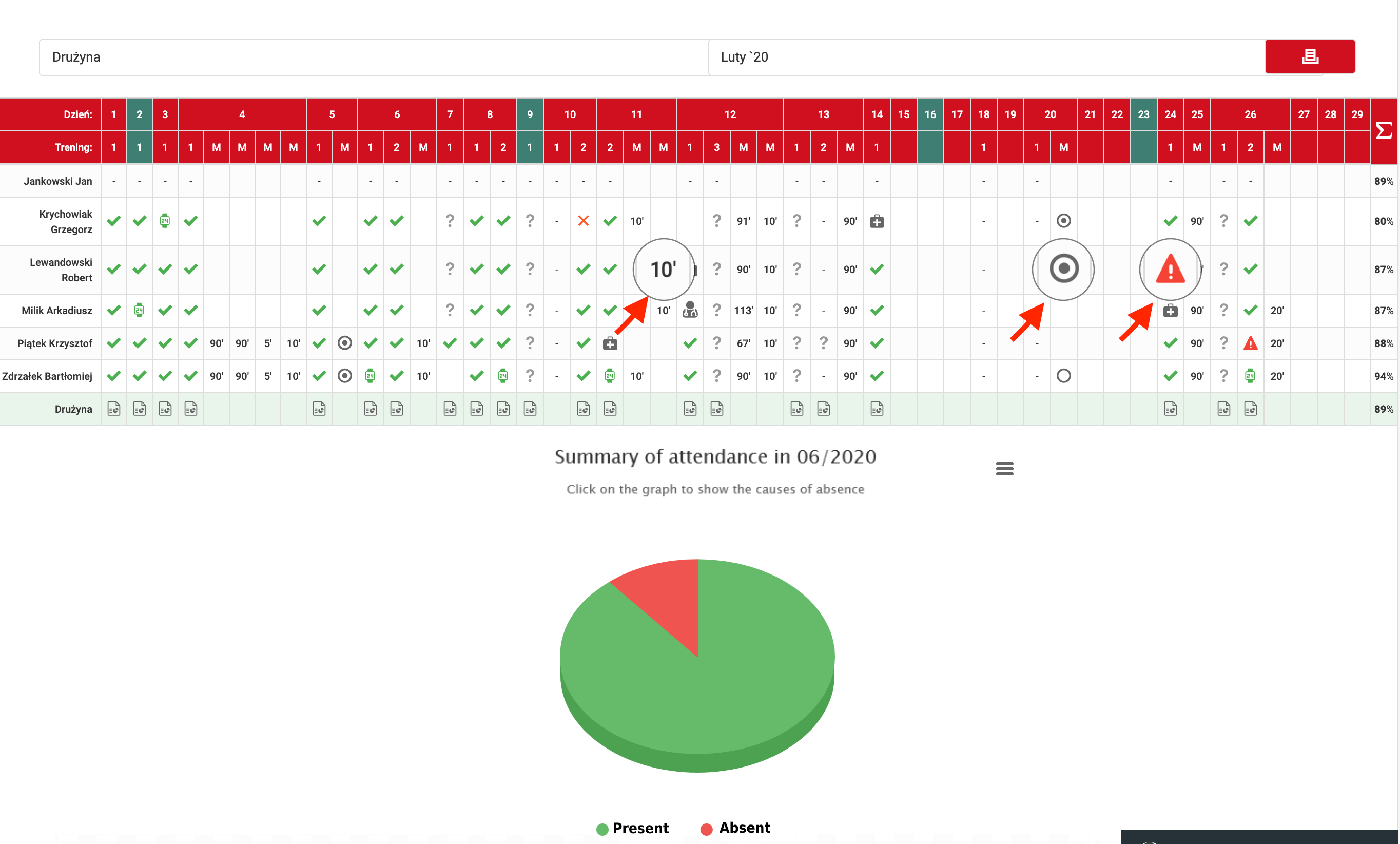 Die Tabelle zeigt die Daten zu Trainings und Spielen in zusammengefasster Form. Symbole kennzeichnen die Anwesenheit eines Spielers beim Training oder den Grund für seine Abwesenheit. Symbole für Spiele (leerer oder voller Kreis) zeigen die Berufung in die Startaufstellung oder auf die Ersatzbank an. Wenn Sie die Spielstatistiken ausfüllen, erscheint in der Tabelle die vom Spieler gespielte Zeit. Oben auf der Seite haben Sie Kontrollkästchen, mit denen Sie die angezeigten Monate ändern sowie die Statistiken der Tabelle auf einen ausgewählten Spieler eingrenzen können. In der letzten Spalte und in der letzten Zeile der Tabelle finden Sie Zusammenfassungen der Anwesenheit des Spielers im Monat und der Anwesenheit des Teams bei einer bestimmten Trainingseinheit.