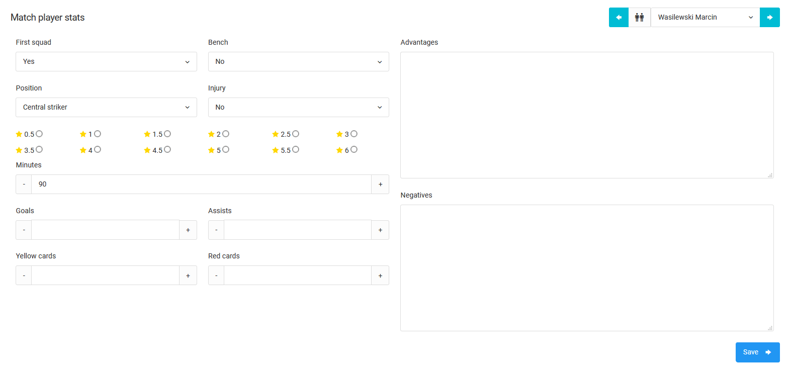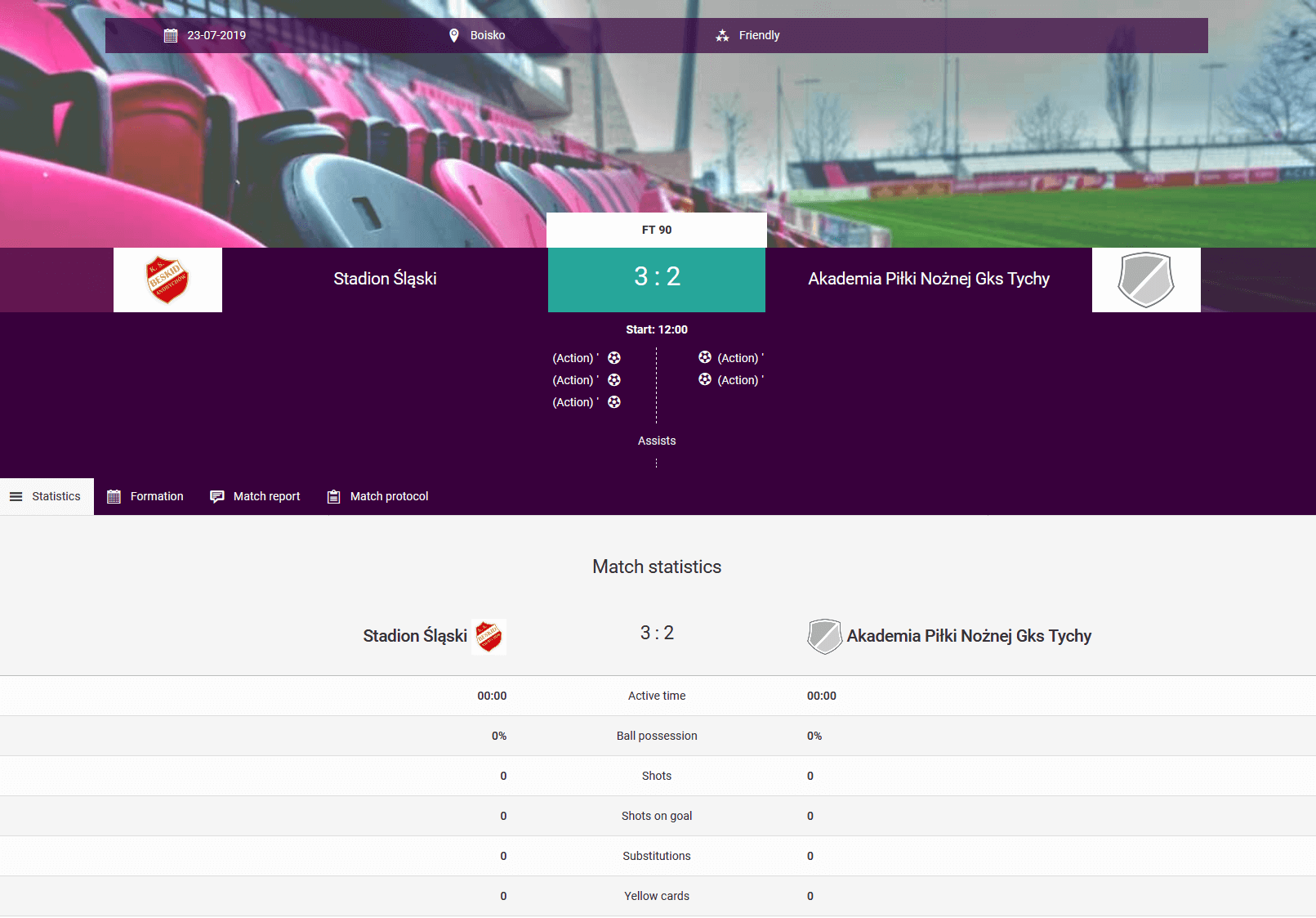 Wie Sie auf dem obigen Bild sehen können, können Sie einzelne Spielerstatistiken manuell eingeben. Neben den grundlegenden Elementen wie erzielte Tore oder Punkte können Sie Informationen über die Spielminuten, Assistenten und Strafen hinzufügen. Darüber hinaus können Sie einen Spieler für seine Leistung im Spiel bewerten und die Vor- und Nachteile seines Spiels im Match beschreiben. Das Endergebnis der ausgefüllten Spielstatistik ist ein vollständiger Spielbericht.