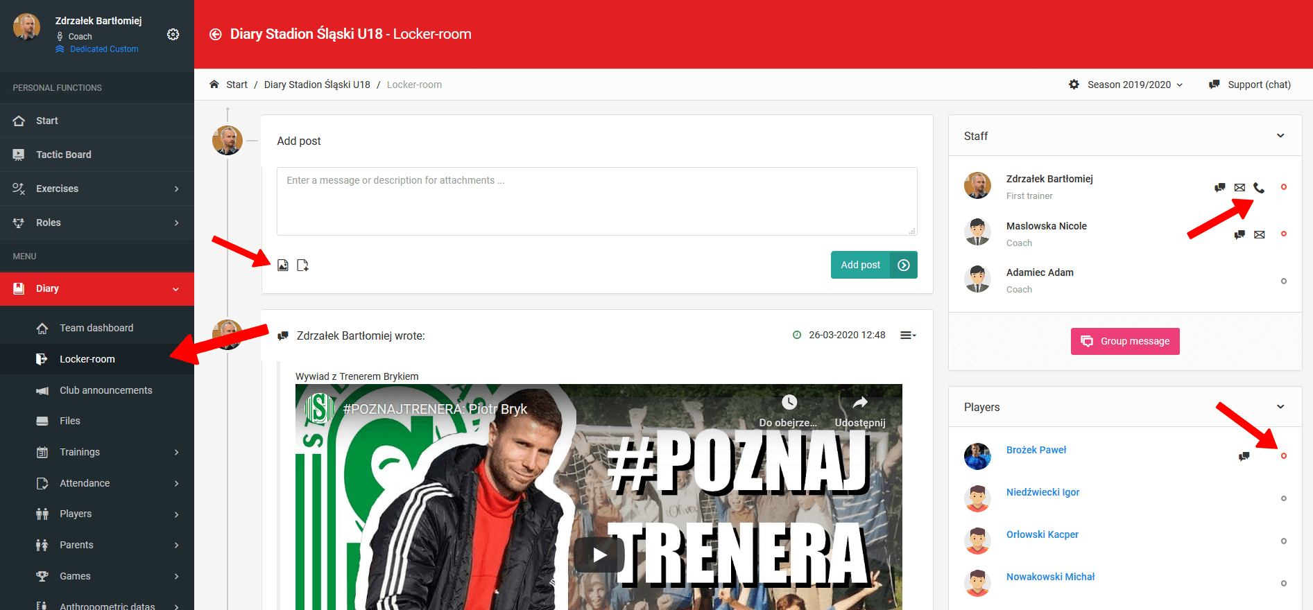 Το αποδυτήριο και η λειτουργία συμβουλίου είναι μια κλειστή ομάδα χρηστών όπου μπορείτε να μοιραστείτε αρχεία, βίντεο, φωτογραφίες ή συνδέσμους. Επιπλέον, εδώ μπορείτε να ξεκινήσετε μια ομαδική συνομιλία με επιλεγμένους χρήστες καθώς και μια ιδιωτική συνομιλία με έναν καθορισμένο προπονητή. Το αποδυτήριο και το συμβούλιο διατίθενται επίσης μέσω της εφαρμογής για κινητά και κάθε ανάρτηση που προσθέτετε δημιουργεί μια ειδοποίηση push για καθορισμένους χρήστες.