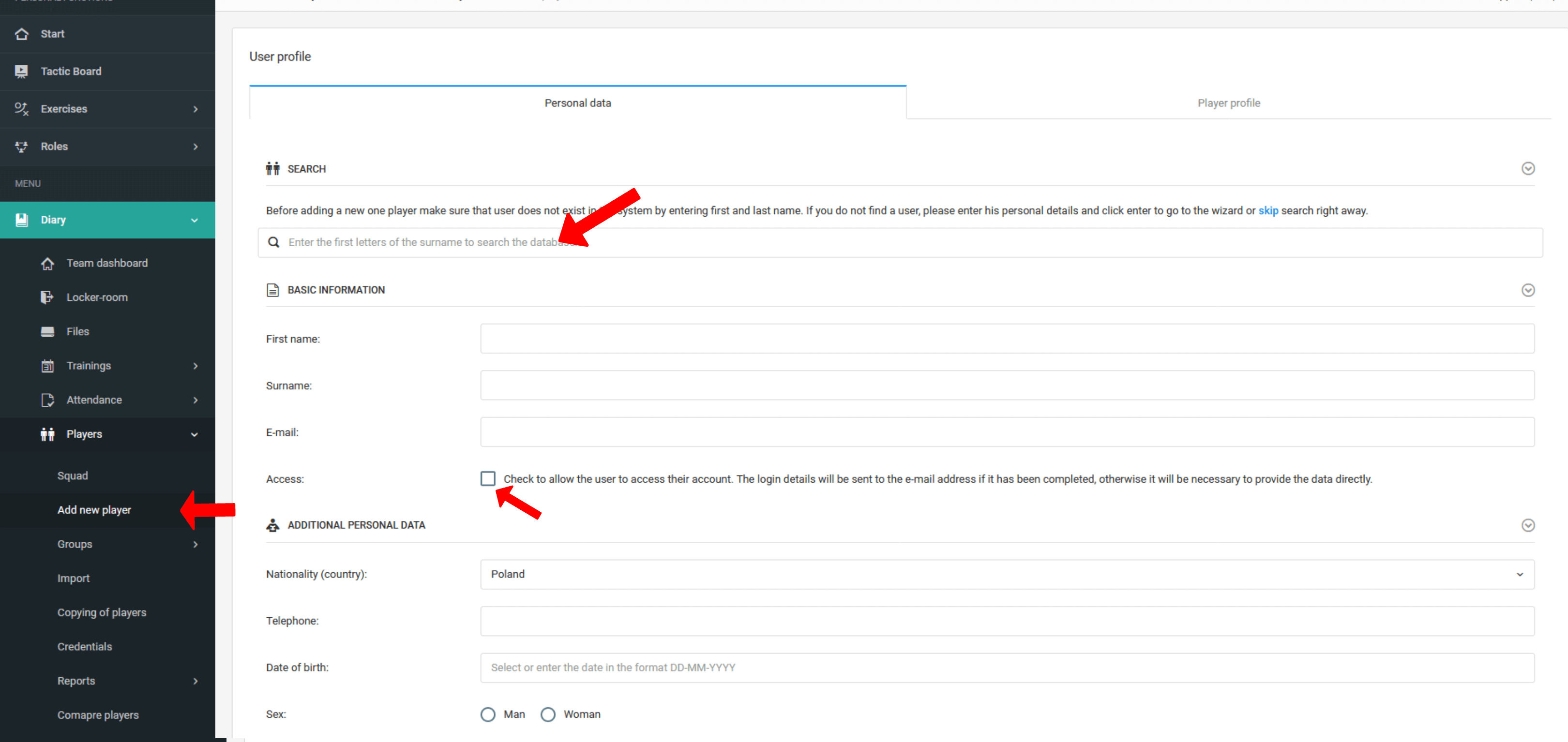 Για να προσθέσετε παίκτες, επιλέξτε από το αριστερό μενού ημερολόγιο παίκτες b> προσθήκη νέου παίκτη . Στο επόμενο βήμα θα μεταβείτε στη φόρμα προσθήκης νέου παίκτη. Εάν ένας παίκτης βρίσκεται ήδη στο σύστημα, μπορείτε να τον αναζητήσετε στη μηχανή αναζήτησης και να τον προσθέσετε έτσι στην ομάδα σας. Ωστόσο, εάν δεν είναι ακόμη στο σύστημα, δημιουργήστε τον δίνοντας όνομα, e-mail και ημερομηνία γέννησης. Εάν θέλετε ο παίκτης να έχει πρόσβαση στο σύστημα, δώστε του επίσης ένα όνομα χρήστη και έναν κωδικό πρόσβασης κάνοντας κλικ στο γκρι πλαίσιο ελέγχου.