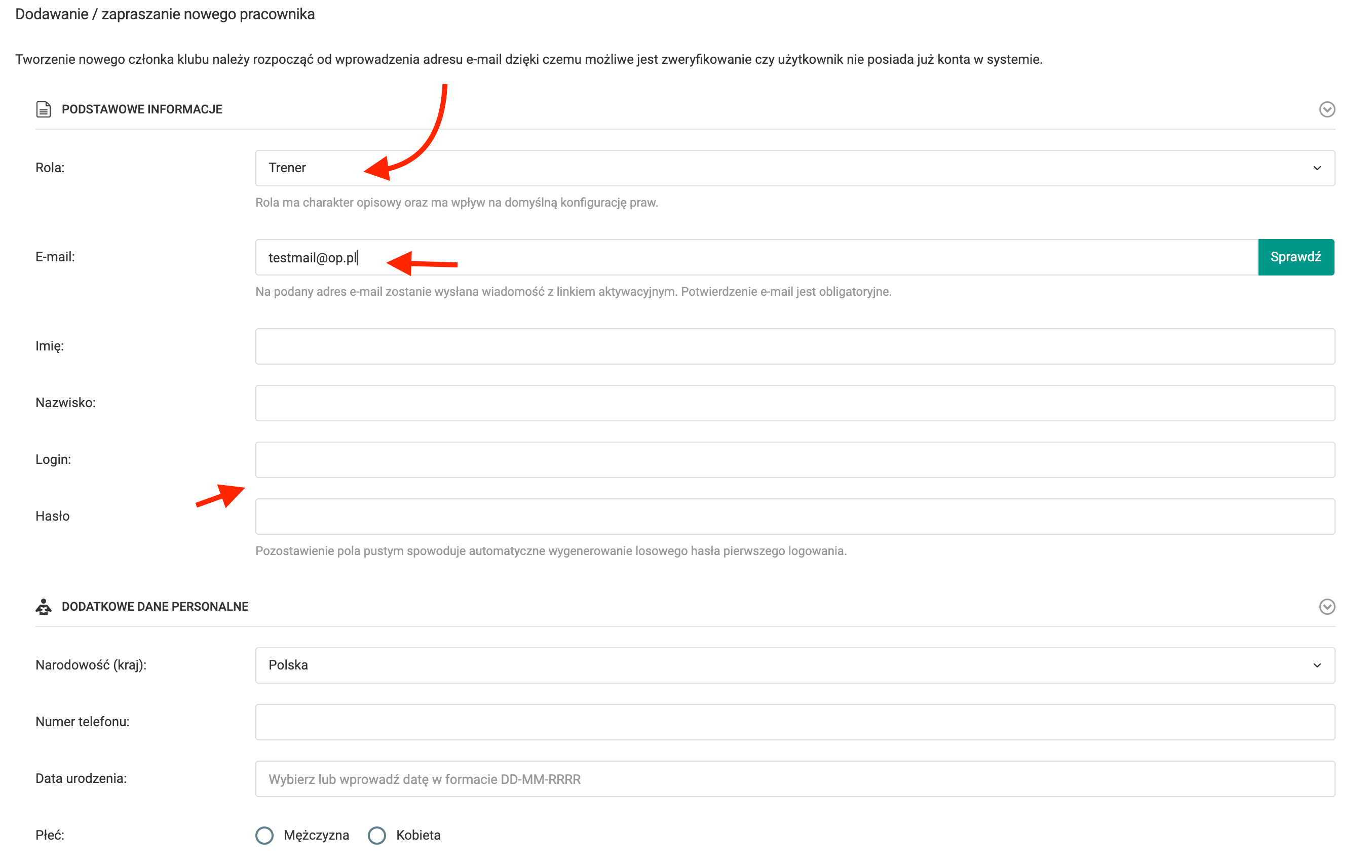 Aby dodać pracowników w lewym menu wybierz opcję klub pracownicy dodaj nowego. W kolejnym kroku przejdziesz do formularza dodawania nowego pracownika. Tworzenie nowego pracownika należy rozpocząć od wprowadzenia adresu e-mail, dzięki czemu możliwe jest zweryfikowanie czy użytkownik nie posiada już konta w systemie i ewentualne zaproszenie go do Twojego klubu. Jeżeli użytkownika nie ma jeszcze konta w systemie, stwórz go ustalając mu rolę w klubie, a następnie nadając imię, nazwisko, e-mail oraz login i hasło. Ponadto możesz uzupełnić takie dane jak: datę urodzenia, narodowość, płeć czy numer telefonu.
