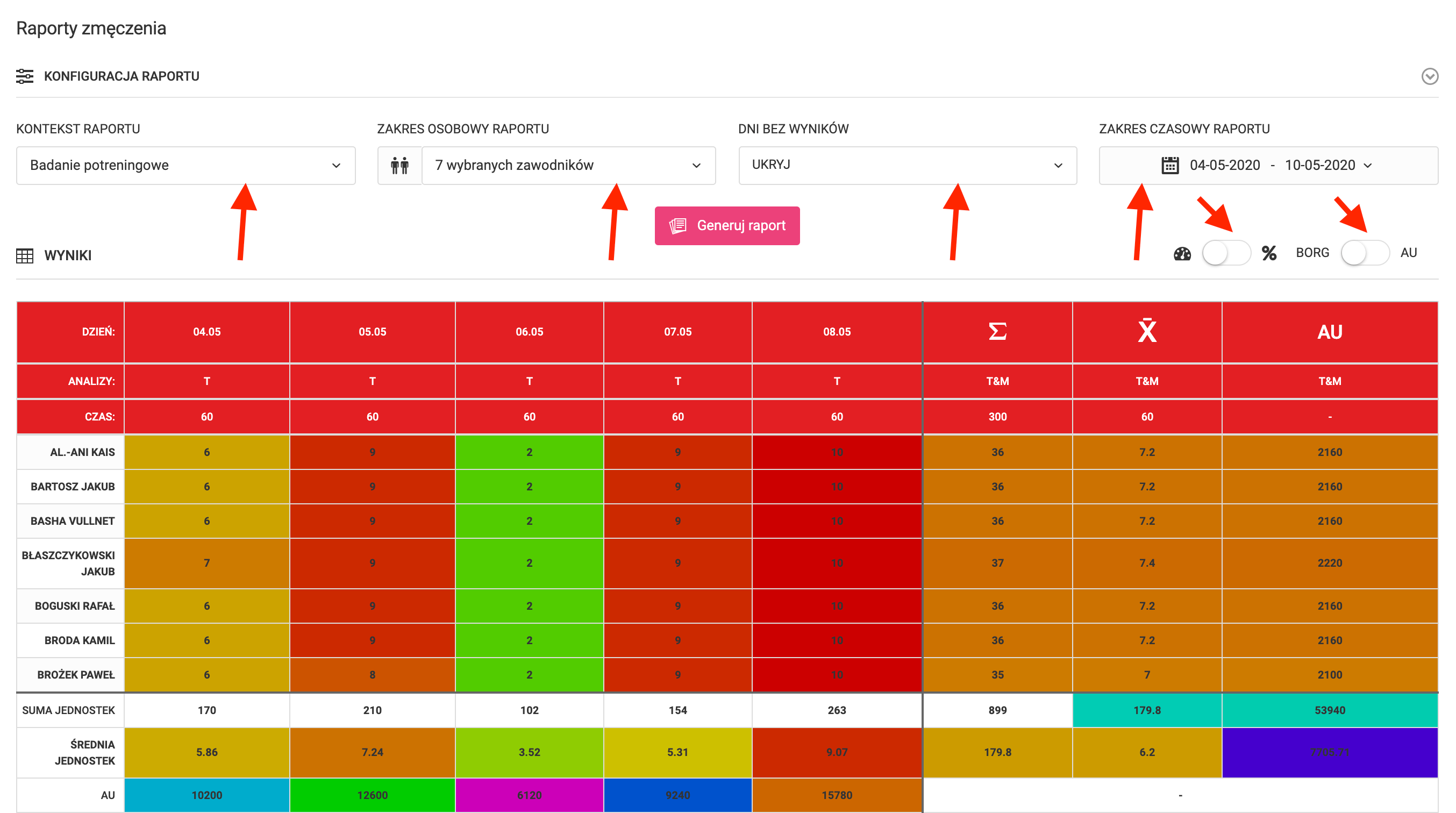 W systemie dostępny jest także raport zbiorczy, pokazujący bardzo szeroki zakres danych wraz z analizami. Nad tabelą raportu dostępny mamy konfigurator. Podobnie jak w przypadku raportów szczegółowych możesz wybierać jakiego typu badania mają pojawić się w tabeli. Możesz zaznaczyć jakich zawodników ma dotyczyć raport, zaznaczać czasowy zakres raportu, jak i również ukrywać dni bez pomiarów.