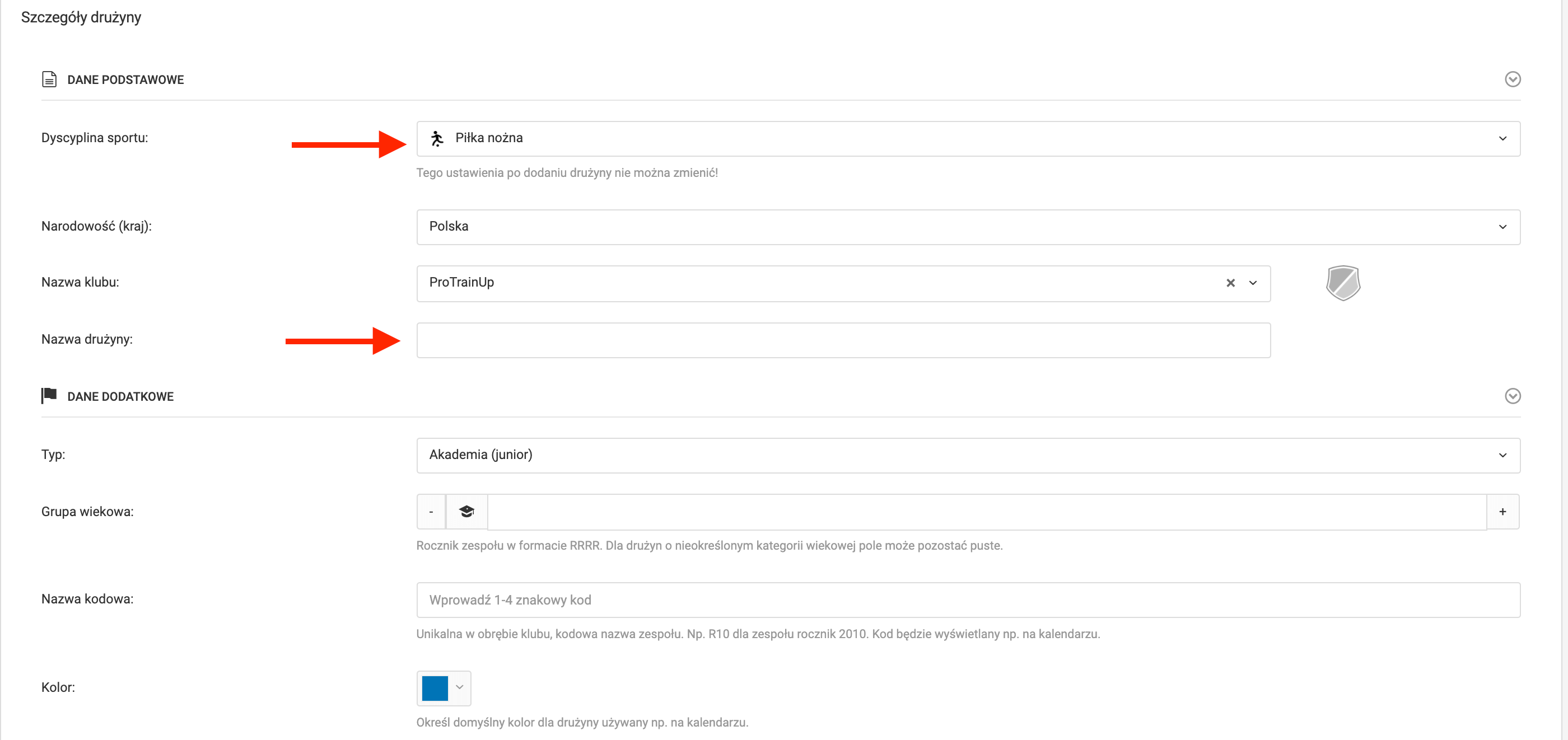 Stworzenie drużyny, to element konieczny, aby rozpocząć prace. Aby stworzyć drużynę, kliknij w lewym menu dziennik drużyna dodaj nową. W formularzu tworzenia drużyny masz do uzupełnienia kilka istotnych pól. Najważniejsza z nich to dyscyplina oraz nazwa drużyny. Determinuje ona późniejsze wyświetlanie się nazwy naszego zespołu w wielu miejscach dziennika. W polu Nazwa klubu należy wybrać konkretny klub, do którego przynależy drużyna. Jeżeli Twojego klubu nie ma na liście, możesz dodać go ręcznie, wprowadzając jego oficjalną nazwę oraz logo. Kolejnym krokiem jest określenie grupy wiekowej Twojej drużyny, nadanie skróconej nazwy drużyny oraz określenie koloru, który służyć będzie do rozróżnienia drużyn na kalendarzu klubowym.