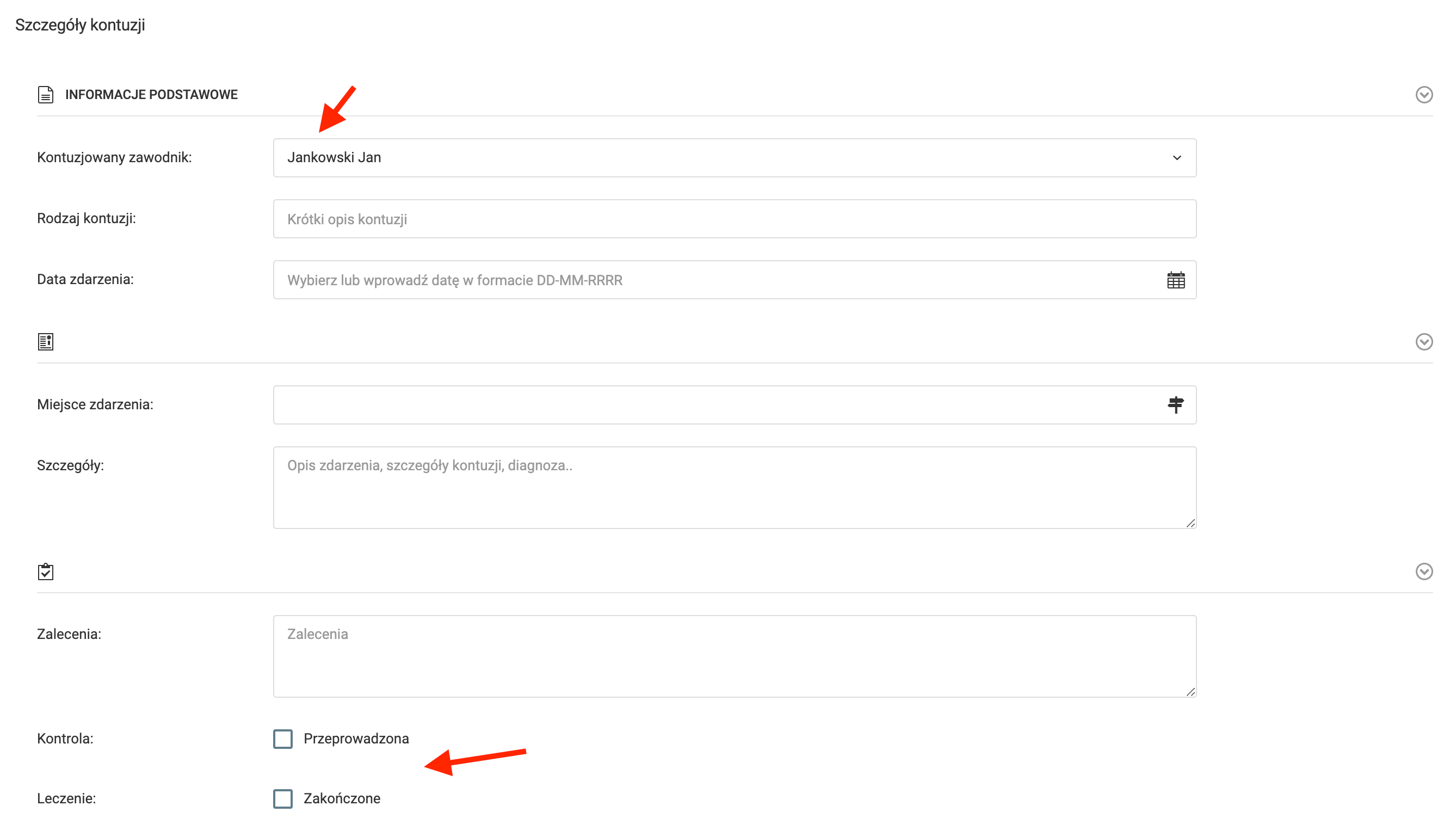 Aby dodać kontuzję wybierz z lewego menu opcję dziennik kontuzje dodaj zdarzenie. Uzupełnij dane wymagane w wyświetlonym formularzu, rozpoczynając od zawodnika, którego dotyczy kontuzja. Wprowadzona kontuzja może zostać zmodyfikowana w dowolnym momencie, np. w celu ustalenia daty kontroli lub zakończenia leczenia.